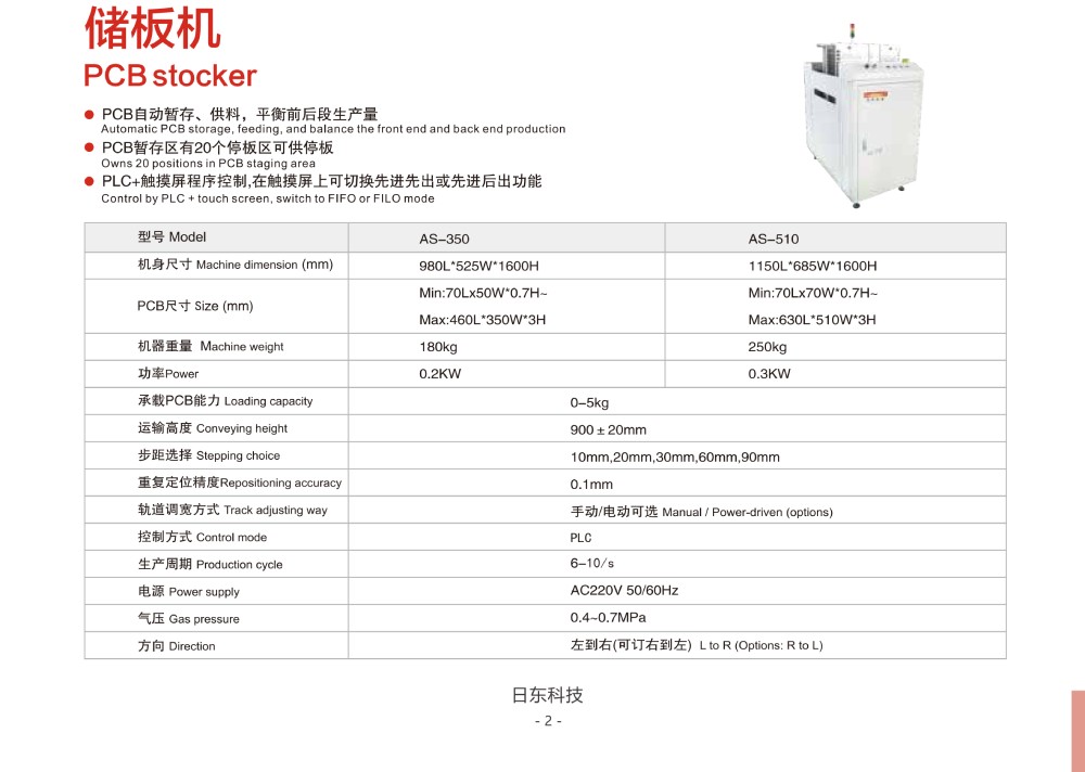 PCB儲板機介紹:PCB自動暫存、供料,平衡前后段生產量;PCB暫存區有20個停板區可供停板;PLC+觸摸屏程序控制,在觸摸屏上可切換先進先出或先進后出功能。