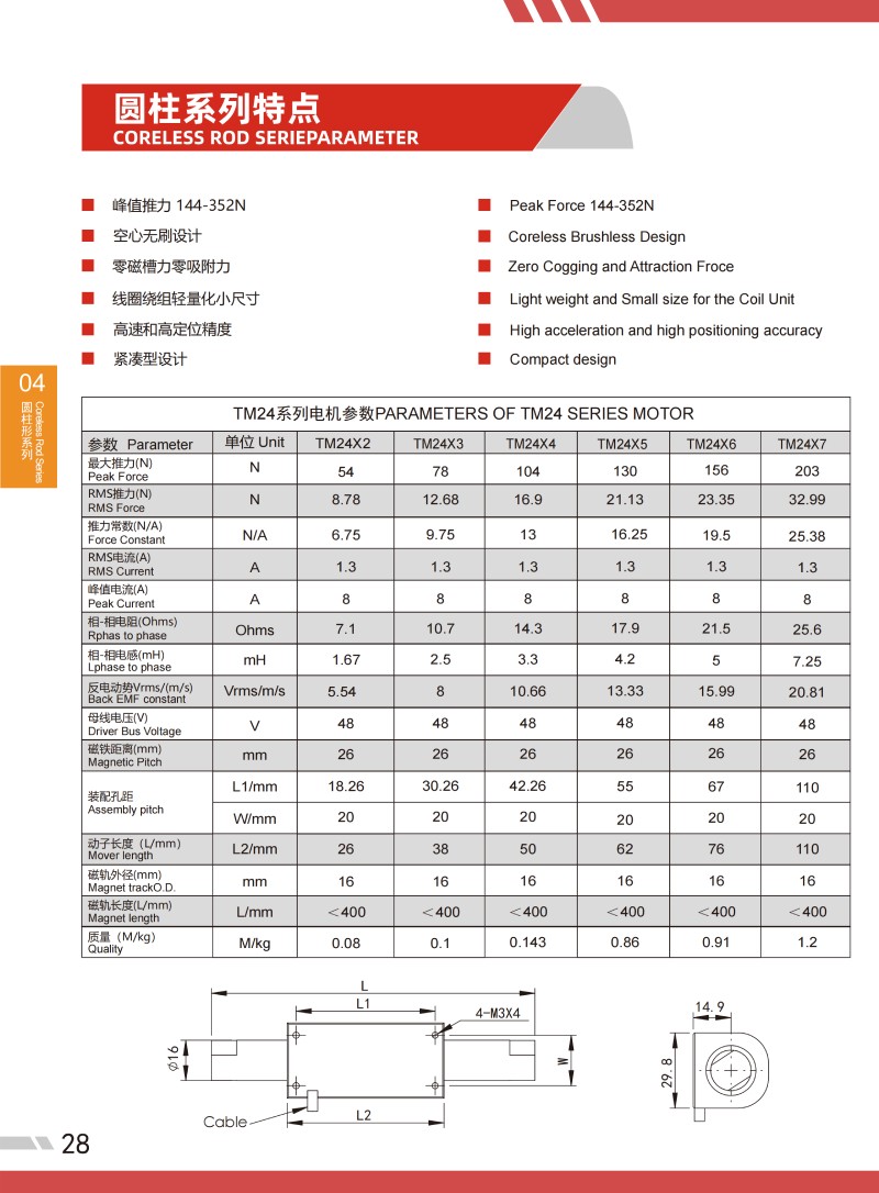 | TM 24系列圓柱形直線電機參數PARAMETERS OF TM 24 SERIES MOTOR | |||||||