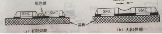 2、二是當(dāng)有兩個以上靠得很近的SMC的焊盤共用一段導(dǎo)線時,應(yīng)用阻焊膜將其分開,避免釬料收縮時產(chǎn)生應(yīng)力使SMC移位或拉裂。