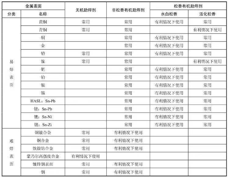 ②有利條件下使用:在表面無(wú)嚴(yán)重的銹膜或類(lèi)似的污染時(shí),可用水白松香助焊劑。通常這類(lèi)金屬表面可用活化松香或非松香有機(jī)材料助焊劑進(jìn)行焊接。