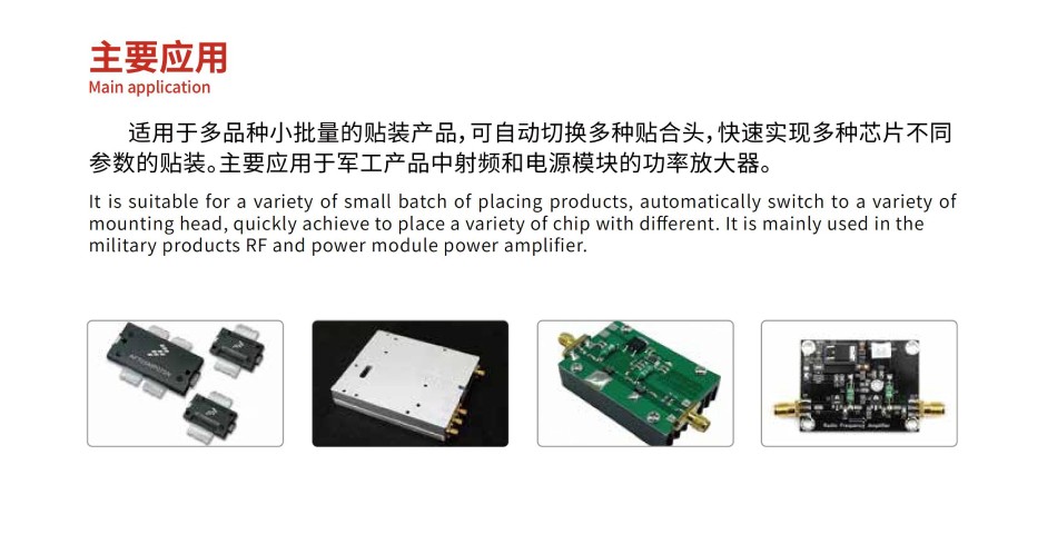 專用型高精度固晶貼合機,適用于多品種小批量的貼裝產(chǎn)品,可自動切換多種貼合頭,快速實現(xiàn)多種芯片不同參數(shù)的貼裝。主要應用于軍工產(chǎn)品中射頻和電源模塊的功率放大器。