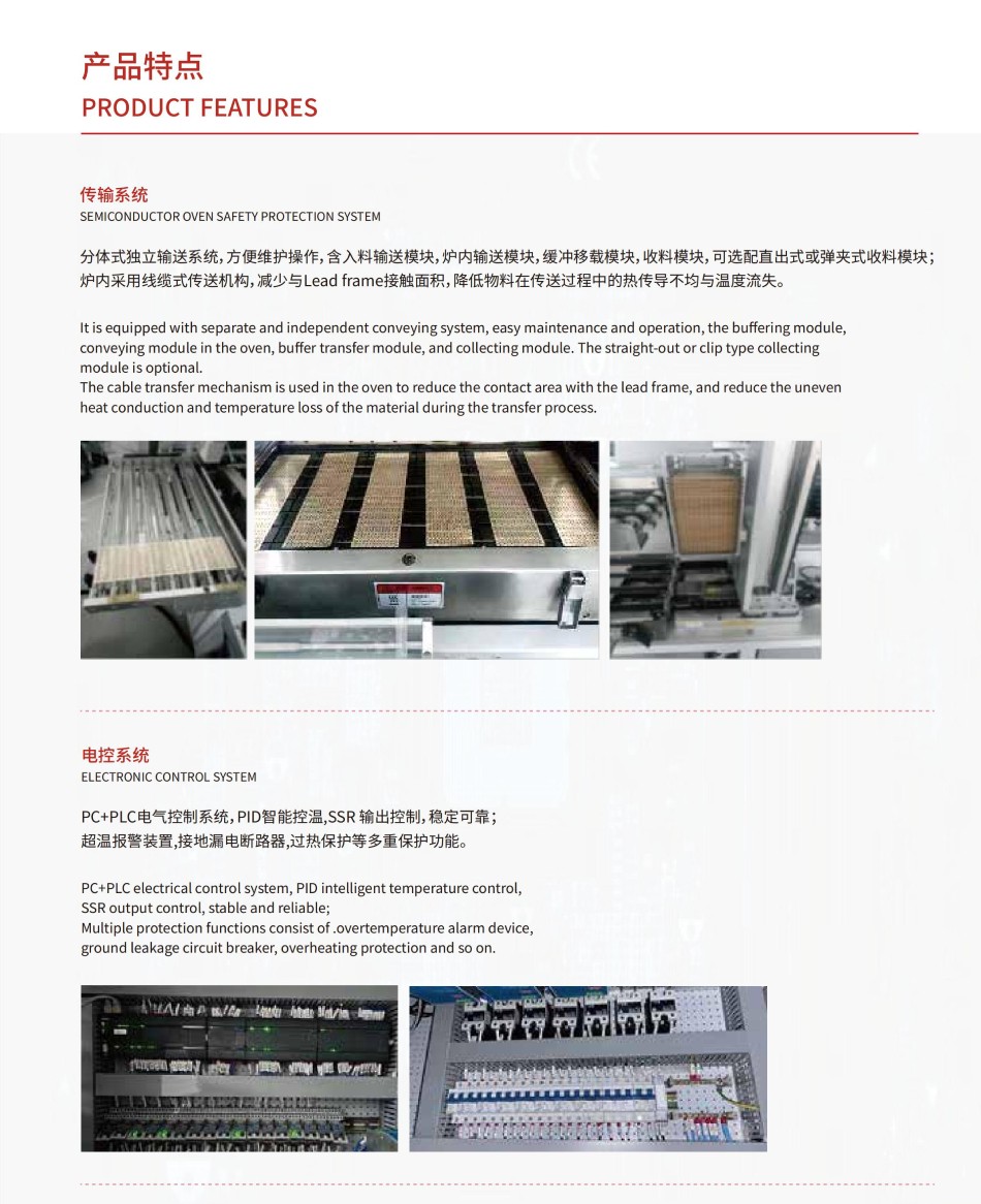 加熱系統:配置六個溫區,各溫區溫度可單獨設置,引線框架單行矩陣排列烘烤。